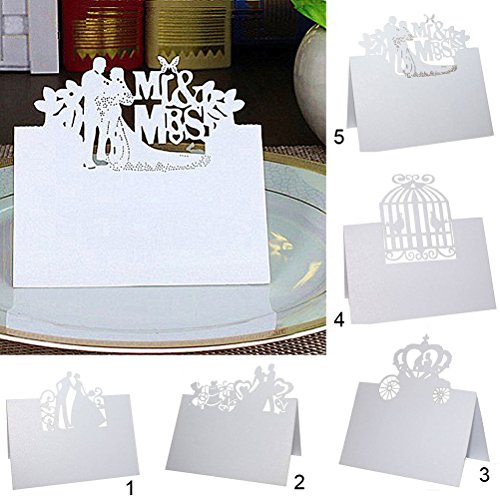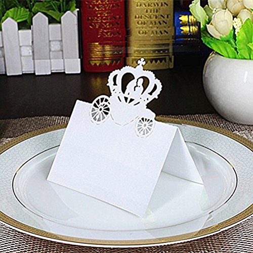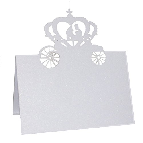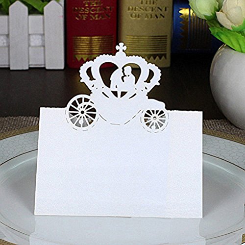 Bride Groom Wedding Decoration White Laser Cut Wedding Party Table Name Place Card Table Number Card Escort Name Card Wedding Party Table Decoration Card Setting Card Seat Card Name Tag, Wedding Party Favor Card with Bride Groom in Pumpkin Carriage Pattern.