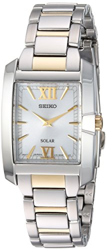 This sleek Womens watch is designed with a rectangular two tone stainless steel case and bracelet, featuring a light dial with highlights of gold.