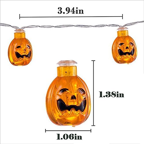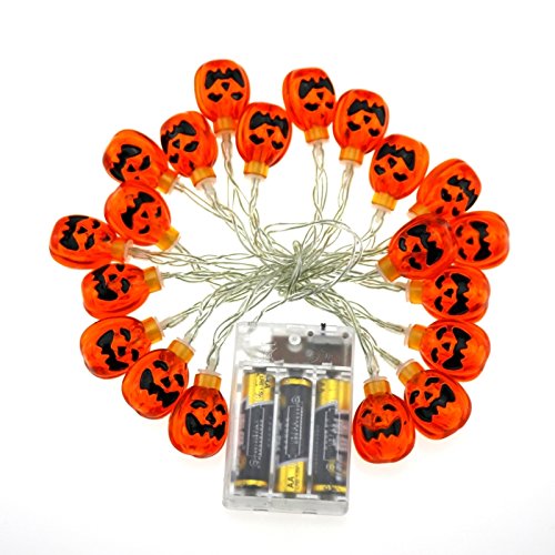 -. Feature : Beautiful Decoration--Halloween is approaching, LEDs string lights a great decoration for Halloween, hotels, bars, parties, home, windows, clubs, concerts, fashion shows, dance halls, KTV and so on. / Battery Operated--String lights of 20 LEDs pumpkins on a well made cord. It uses 3 x AA Batteries. (Not Included) / Using Time--40-60 hours. Low power consumption with a long service time, safe and reliable.Two Modes Switched To Be Chosen: Steady/ Flash. (Non-waterproof) / Move to Anywhere--Since the lights do not require a plug, they can be used anywhere and for any purpose. Better than normal solar string lights. / Easy to Install--safe and easy to install. Easy to replace, reusable, low pressure and more secure.