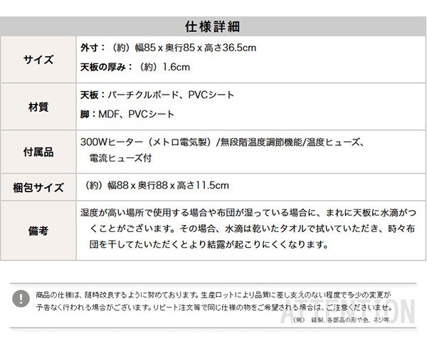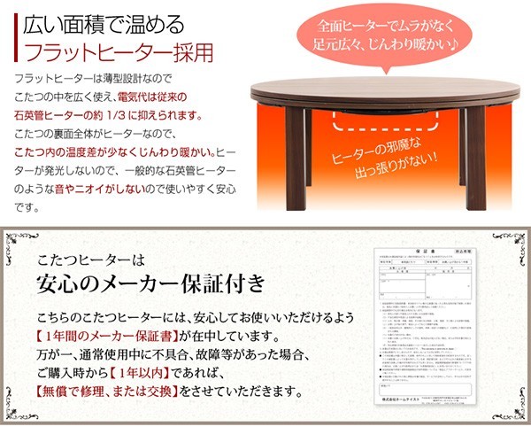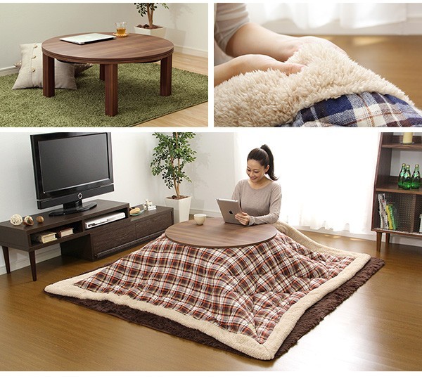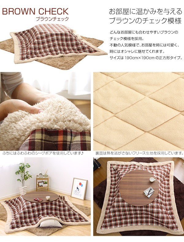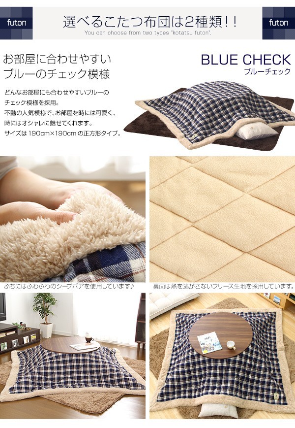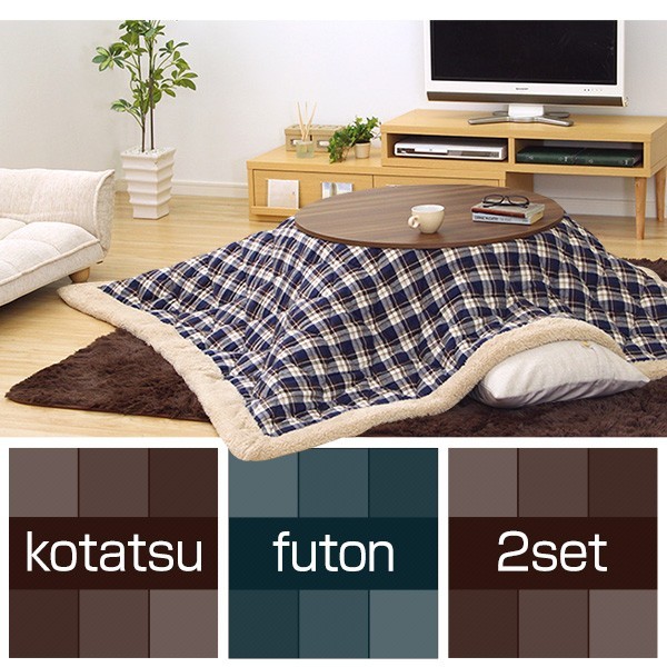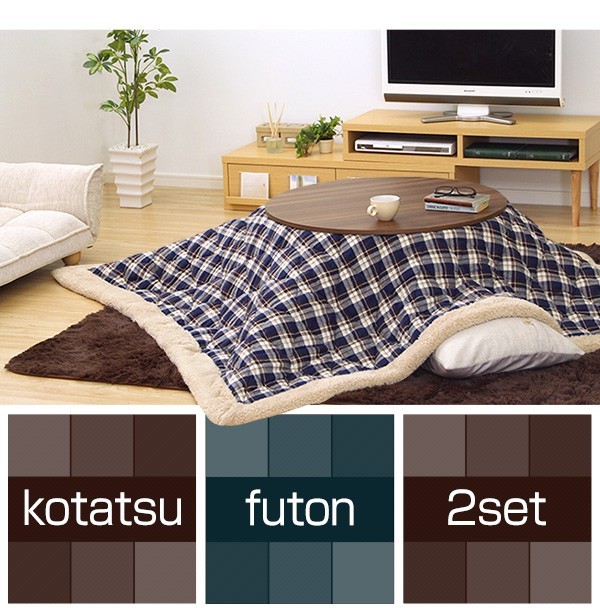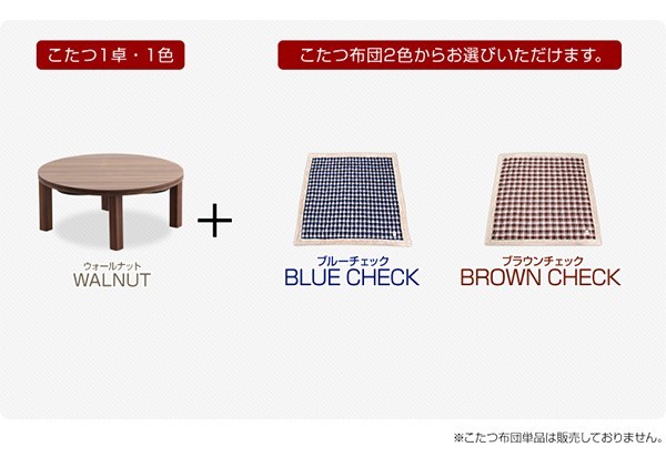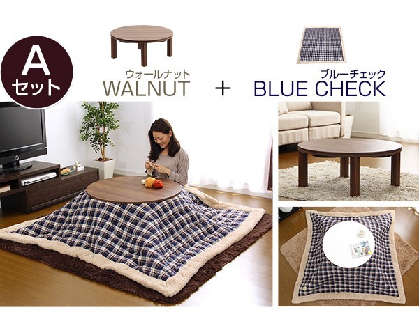 【商品について】チェック柄こたつ布団セット!フラットヒーターこたつ2点セット(丸型・85cm幅)■サイズ:本体外寸:(約)幅85x奥行85x高さ36.5cm (約)17kg布団:(約)幅190x奥行190cm (約)3kg■カラー:Aセット、Bセット■素材:(こたつ本体)天板:パーチクルボード、PVCシート 脚:MDF、PVCシート※付属品:300Wヒーター(メトロ電気工業製)/無段階温度調節機能/温度ヒューズ、電流ヒューズ付(こたつ布団) キルティング製品表側:ポリエステル50%、アクリル30%、その他20%裏側:ポリエステル100%■その他:・完成品でお届けします。※脚はお客様取付け本体:(約)88.5x88x11.5cm (約)18kg布団:(約)55x45x25cm (約)4kg