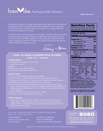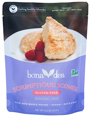 -. Binding : Grocery -. Brand : Bona Dea -. Feature : Free from: Gluten Dairy Soy Nuts Eggs / Non-GMO Project Verified and made with Organic Whole Grains / Versatile & easy-to-make with vegan and dairy-free recipe instructions / Bake them as individual drop scones or as wedges / Allergen free: Produced in a dedicated facility free of gluten, wheat, milk, soy, eggs, tree nuts an -. Label : Bona Dea -. Manufacturer : Bona Dea -. Model : BDSCO2 -. MPN : BDSCO2 -. PackageQuantity : 1 -. PartNumber : BDSCO2 -. ProductGroup : Grocery -. ProductTypeName : GROCERY -. Publisher : Bona Dea -. ReleaseDate : 2015-08-04 -. Studio : Bona Dea -. Title : Bona Dea Gluten Free Scrumptious Scones Mix, 12.6 Oz. (Pack of 2)