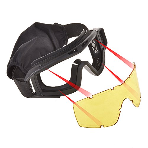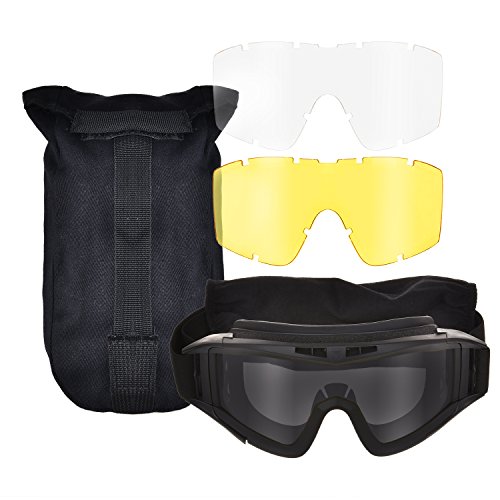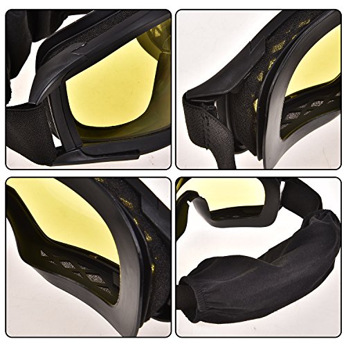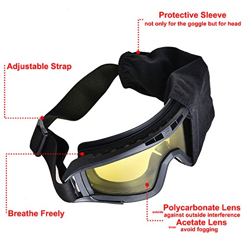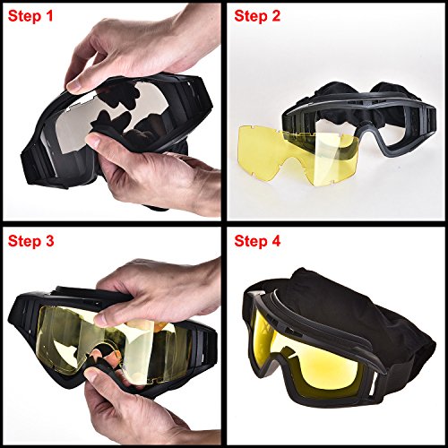 -. Feature : 3 colors: one airsoft safety goggle with THREE EXCHAGEABLE LENSES: clear, smoke and yellow / Adjustable strap: tactical goggle in adjustable strap, MEET DIFFERENT HEAD SIZE, kids or adults, totally could handle / Sleep mask: make the airsoft goggle not only a tactical goggle BUT A SLEEP MASK / VENTED DESIGN: safety goggles enable your skin and eyes breathe freely, anti-fog and and anti-static / KEEP UV Ray AWAY: this eye protective goggle meets the ANSI Z87.1 requirement, could against 96.9% harmful UV ray