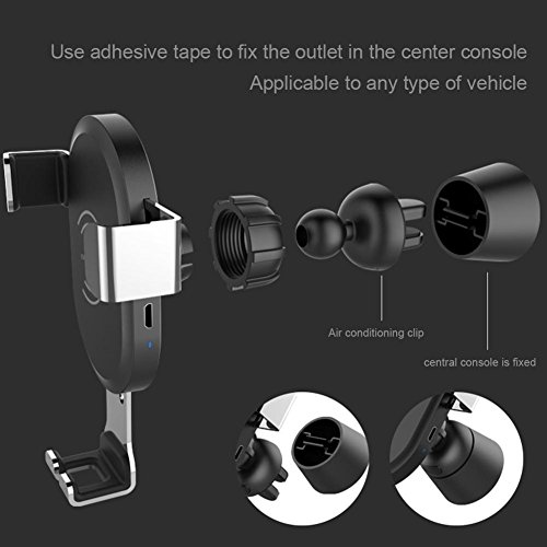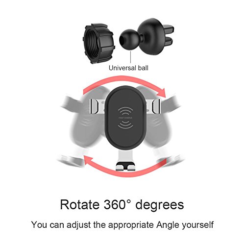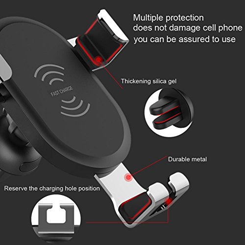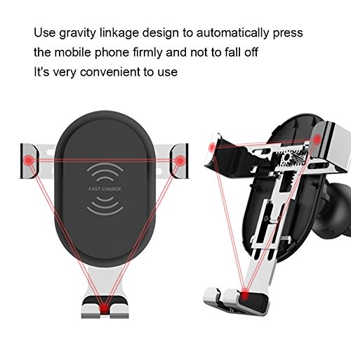 -. Feature : One-hand Operation: This car charger holder is super Convenience to use according to smart gravity Design; Just put on your phone, it will clamp automatically and align the phone with wireless charging sensor. / Faster Charging: The third generation independent coil provide higher charging efficiency , faster charging your phone than old wireless chargers. / Smart Chip: Built-in IC chip intelligently detects the current needed, and optimize charging with voltage protection, temperature control, and more advanced safety protection. (It's normal for your phone to get warm when wireless charging.) / Air Vent Mount: Compared with windshield or dashboard mount, the air vent mount is much easier for you to reach the phone in the car and causes less distraction during driving. Moreover, the car air conditioner can cool the charger down in summer. / Warranty and Compatible Devices: 30 days money back. If don't Suitable for your phone, 100% refund to you. Universal for Qi Enabled smartphones from 4.0 to 6.2 inches such as Samsung Galaxy S9 / S9 Plus / S8 / S8 Plus / S7 / S7 Edge / S6, iPhone X / 8 / 8 Plus and more(Note: Please don't put the thick case(Like OtterBox, LifeProof, Zizo, UAG cases) or uneven/red case on your phone, Recommend QC 3.0 charger adapter as input power.)