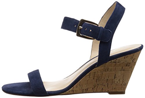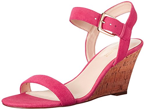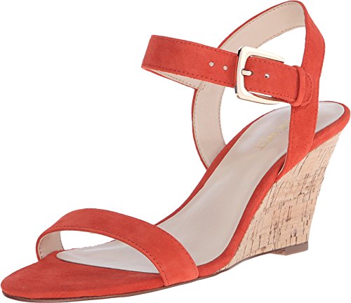 Wedge sandal featuring slender suede-leather straps and gold-tone buckle at ankle