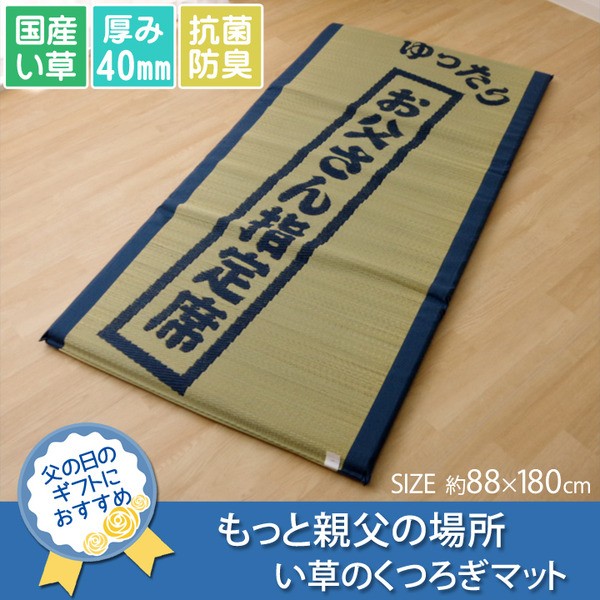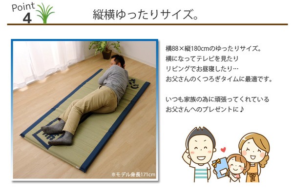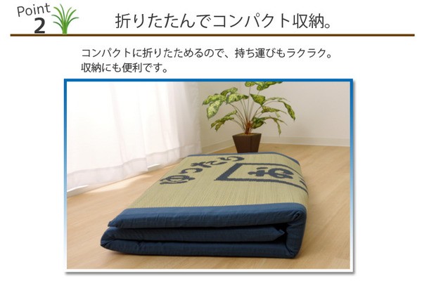 寝っころがってテレビを見たり、折りたたんで腰かけたり、リビングでのお昼寝用に、などいろいろな使い方ができるフリーマットです。お仕事のちょっとした休憩時間の仮眠にも最適です。い草には1.綿の約2.5倍の吸湿性があり汗のじめじめを軽減します。2.湿度の調整作用があり、蒸れにくく快適な就寝を促します。3.汗のにおいの元となる化学物質を90%以上抑え、においを軽減します。などの効果があります。中材には固わた40mmを使用していますのでフローリングでも快適にご使用頂けます。い草に青森ヒバ加工を施しています。(抗菌・防臭効果)青森県のヒバの木から抽出した「ヒバ油」を現地に送り、メーカー独自の技術で材料や商品に加工しました。「ヒバ油」には、ヒノキチオールという天然物質としては極めて抗菌性の高い成分が含まれ、医療や食品など多分野で利用研究が進められています。※自然素材であること、また職人が一つ一つ手作業にて加工を行うため、形状のバラつきや表示サイズと多少異なることがあります。ご了承下さい。