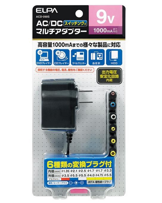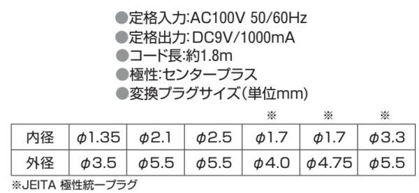 家庭用コンセント(AC100V)をDC9Vの電圧に変換することができます。安定化回路内蔵で、電圧変動が少なく機器にやさしい。スイッチング式。