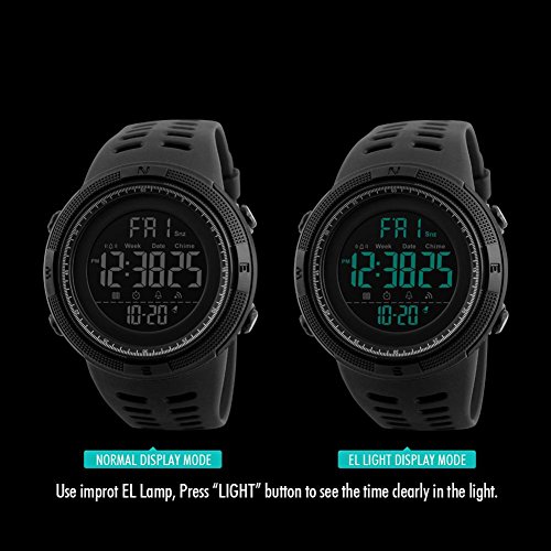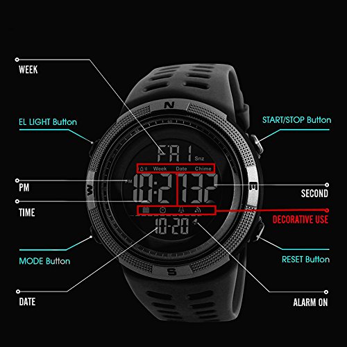 -. Feature : Multifunction: Waterproof, shock resistant alarm, chime hourly, stopwatch, count down, double time zone ,EL backlight, auto calendar,12/24H time, display hour, minute, second, month, day, week, What are you waiting for? This is a great value watch you don't want to miss / Water Resistant: 164FT/50M waterproof, swim, wash hands and shower without taking it off NOTE: Don't press any button in the water / Count Down: The maximum count down time is 23hours,59minutes,59seconds chronograph: 1/100 second chronograph with split functions dual Time: dual time supports two different time zone. It's convenient to set daily alarm and chime hourly / Button Batteries: Battery code:CR2032 ,The battery sold by normal shops around you is easy to buy / What's in the package: SKMEI Sport Watch x 1, Instruction Manual x 1