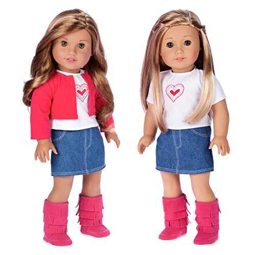 - This cool outfit includes fuchsia jacket, white t-shirt with pink heart with rhinestones, light blue denim mini skirt and hot fuchsia boots.