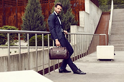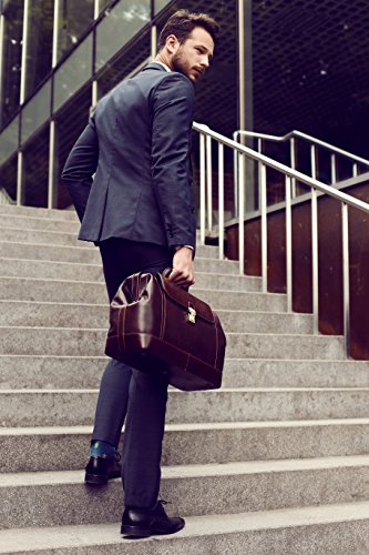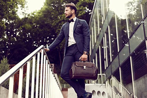 -. Feature : DESIGN - a genuine leather doctor bag, as classic as the play. And just like the play, it is all about character. For one with confidence and stature. To add more originality while remaining completely classic and polished. DIMENSIONS: Height: 10.2 in (26 cm) Length: 15.7 in (40 cm) Width: 6.3in (16 cm) Weight: 3lb 8oz (1.6 kg) / LAPTOP SIZED • Room for laptop up to 15" in diameter (e.g. MacBook 15" as well as MacBook air). GADGET FRIENDLY • Pocket to keep your tablet at a convenient reach. • Pockets for cards and pens. JET SET • Meets cabin size requirements with room to spare. FOR YOUR CARRYING COMFORT • Carry handle with pleasant grip for easy carrying in hand. / TO STAY ORGANIZED • Gaping frame opening that keeps shape and allows convenient access. • One spacious compartment and additional pockets outside and inside to organize your belongings. • Suitable for A4 documents and folders. BETTER SAFE THAN SORRY • Reliable brass hardware. • Closure with a working key lock. • Front pocket with a push button closure. • Metal studs protect the bottom from harm. / MATERIALS • Exterior made from genuine top grain calfskin that will last you for decades. • Interior fully lined with cotton and easy to clean. • We are well aware that men don't like getting re-accustomed to a new bag. Therefore we make sure to offer quality materials that will last long and require little maintenance. It will be a good while before you feel any need to look for another bag. / TAN • Hand dyed using vegetable tanning method, which utilizes only natural materials and doesn't contain harmful chemicals. • This artisan technique maintains the natural look of leather, rendering each skin one of a kind with a slightly different pattern. BE A KEEPER • Comes with a dust bag that is to be used when the bag is stored. • Dust bag protects it from the sun, dust, scratches or stains while also allowing the leather to breathe.