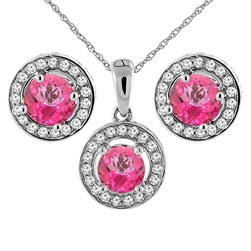 -. Title : 14K White Gold Natural Pink Topaz Earrings and Pendant Set with Diamond Halo Round 5 mm