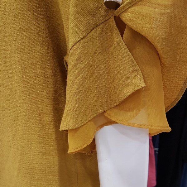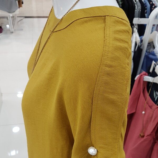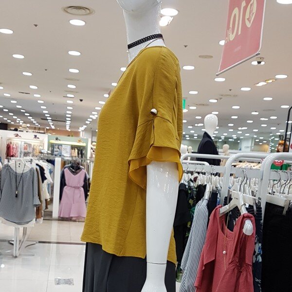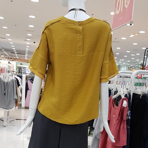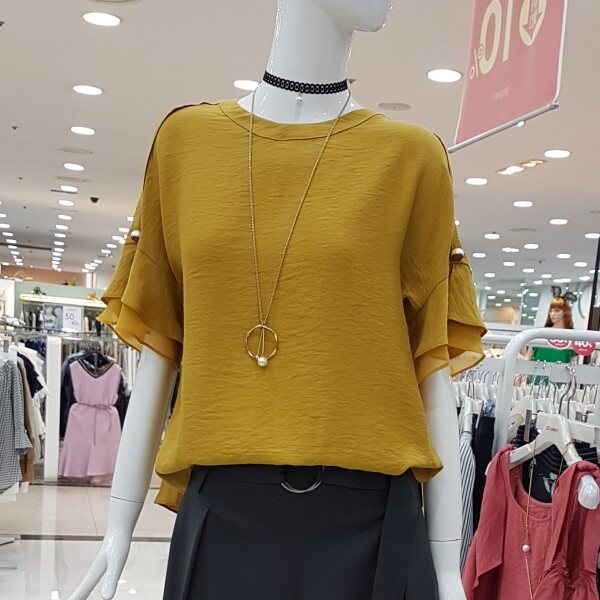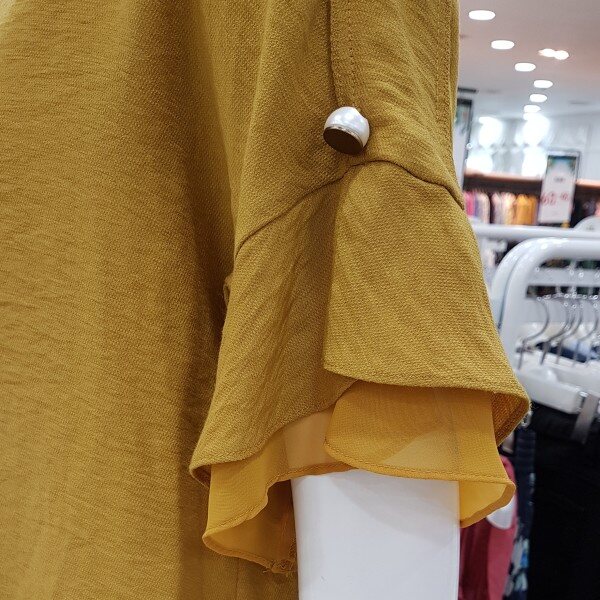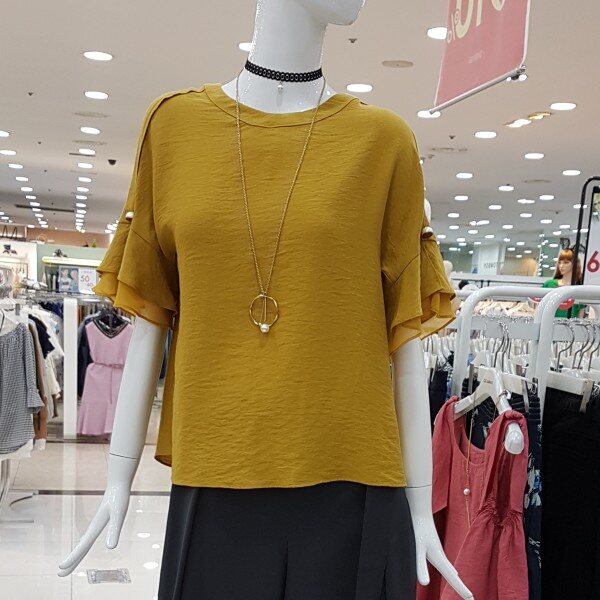 소매겹러플이 여성스런블라우스네요세련된 머스타드컬러에 목걸이셋트네용?가벼운소재에 시원하구요스커트,팬츠 다양하게 코디좋으셔요