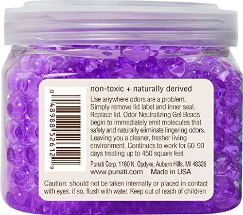 SMELLS BEGONE Lavender Vanilla Odor Eliminator Gel Beads will eliminate and neutralize odors while leaving behind a light and pleasant fragrance that is not overpowering. The Gel Beads will continually neutralize unwanted odors for 60-90 days in up to 450 square feet. Simply remove the top label, open the jar to remove the freshness seal underneath, and screw the lid back on. Place anywhere odors linger.Feature
