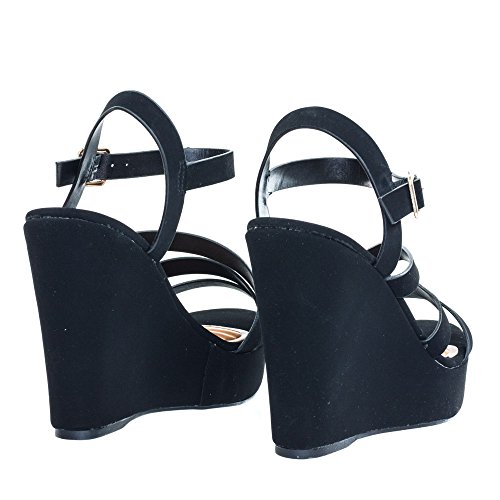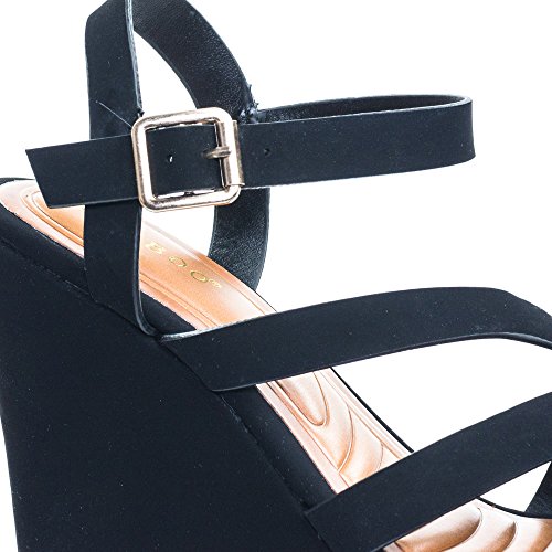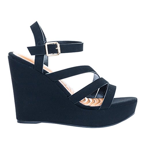 Binding : Apparel Product Description About This Shoes :These sanfal features a covered platform wedge, open toe construction, triple cage strap design, adjustable ankle strap and textured padded insole. Brand - Bamboo Colors Available: Black Occasion: Formal Shoe Type: Platforms Wedges Shoe Style: Platforms Wedges Inner Lining: synthetic Heel Height In Inches - 5 Heel Style - Wedge Toe Style - open-toe Platform Height In Inches - 1.50" Shaft Height In Inches - Circumference Opening - Strap Type - ankle-strap Sole - manmade All Man Made Material unless otherwise stated. Computer/Phone/Table monitors might show color differently because of its quality or calibration, we suggest you look at the photo in at least 3 monitors if you need exact color match of your shoes. 0