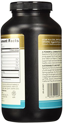 ReleaseDate : 2015-01-29 Studio : Spectrum Publisher : Spectrum Binding : Health and Beauty Product Description Spectrum Essentials Fish Oil With Vitamin D Description: Omega-3 for Brain, Vision and Heart Health. Vitamin D for Heart Health, Bone Health and Immune System Support. A Serving Has. 520gm EPA/DHA and 1,000 IU Vitamin D. A Powerful Combination of Nutrients Spectrum's Fish Oil with Vitamin D combines our purity-tested Fish Oil, with its rich stores of Omega-3 EPA and DHA, with a potent dose of Vitamin D. These combined nutrients support heart and bone health while also promoting healthy vision, brain and immune functions. The Vitamin D3 (cholecalciferol) used in this formulation is a naturally occurring form of Vitamin D that is readily absorbed by the human body. Sustainability is one of our core values. Our Fish Oil comes from non-threatened species of wild-caught fish that are low on the food chain. Harvesting these types of fish also ensures that our oil conforms to the Council for Responsible Nutrition's stringent purity standards related to harmful contaminants like PCBs, dioxins and heavy metals. Disclaimer: These statements have not been evaluated by the FDA. These products are not intended to diagnose, treat, cure, or prevent any disease. 0