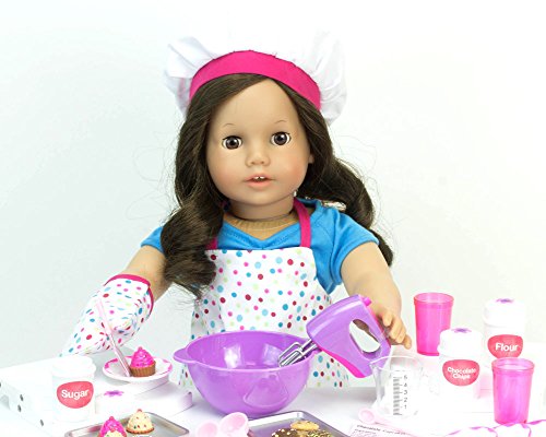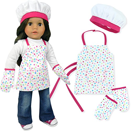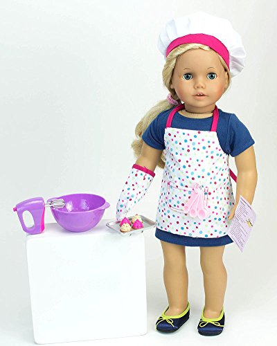 This adorable little baking set includes 2 oven mitts, a chef's hat and polka-dot apron for 18 inch Dolls. Doll, Shoes, Clothes and Baking Utensils Not Included. 3 piece accessory set. © 2014 Sophia's- All Rights Reserved. Not affiliated with American Girl®, Reg. Trademark of American Girl, LLC.Feature