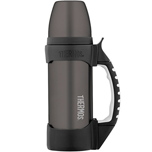 Studio : Thermos Publisher : Thermos Binding : Kitchen Product Description Perfect for hikers, campers and others in need of an efficient method of transporting large quantities of water, the THERMOS 1.1 quart Stainless Steel Beverage Bottle is here. Made of high quality, durable stainless steel this beverage bottle is tough. It also utilizes THERMOS vacuum insulation technology which virtually eliminates temperature change within the beverage container by creating an airless space between two stainless steel walls. The result is a superior insulated container you can depend on to keep your beverages hotter, colder, fresher and longer. This beverage bottle keeps beverages hot or cold for 24 hours, making it a great choice for wherever life's adventures may take you. Additional features include an insulated stainless steel cup, a twist and pour stopper that lets you pour without removing the stopper, an extra-large ergonomically designed handle with soft, non-slip grip and a cool to touch, sweat proof exterior. 0