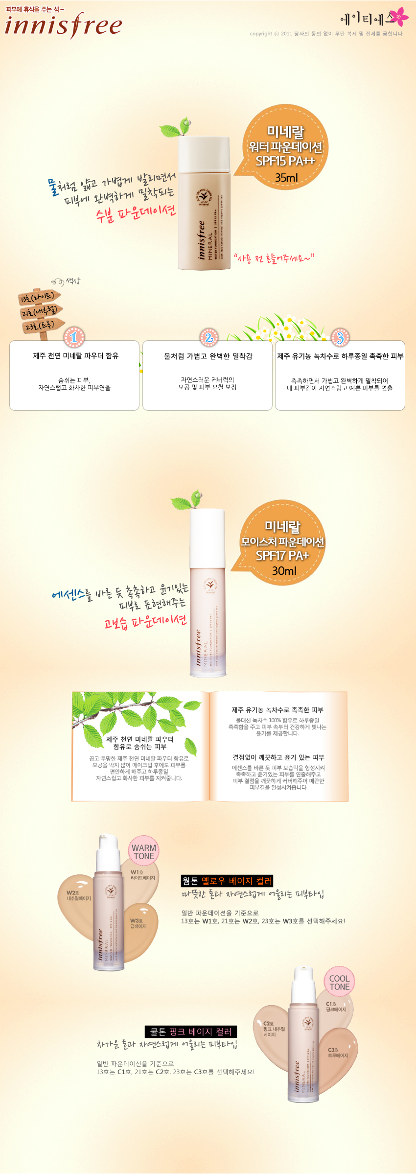 Innisfree Mineral moisture foundation SPF17 PA+ 6 Colors (W1: Light Beige, W2: Natural Beige, W3: Deep Beige, C1: Pink Beige, C2: Pink Natural Beige, C3: True Beige): Formulated with Jeju mineral ingredients and organic green tea water, this mineral moisture foundation helps to portray a dewy and sleek complexion as if essence were applied to your skin. (W: Warm Tone, C: Cool Tone)