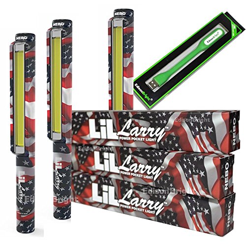 3 PACK 6492 Nebo LiL Larry Patriotic 250 lumen Flashlight COB LED Magnetic Super Bright Worklight with 9 X AAA Batteries and EdisonBright USB powered reading light bundle
