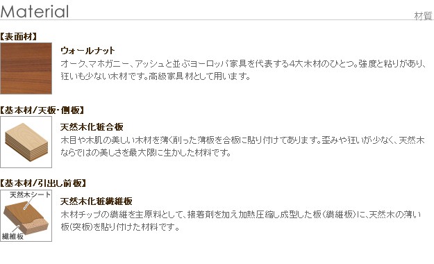 材質:天板・側板-天然木化粧合板(ウォールナット)、引出し前板-天然木化粧繊維板(ウォールナット)、フラップ扉枠-天然木(ウォールナット)、ガラス-強化ガラス、ウレタン樹脂塗装