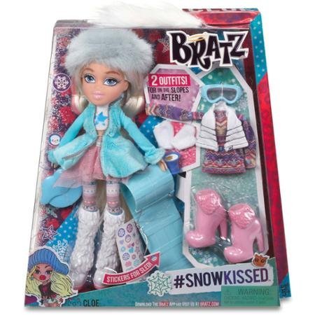 -. Feature : Cloe's SnowKissed sledding style is a faux fur blue coat over a turtleneck croptop, layered sparkling pink skirt, emoji-P.R.Int leggings and knee-high white fur boots / Her second SnowKissed outfit is a white puffy vest, sknit sweater dress and pink faux-fur cuffed ankle boots Her accessories include white mittens, snow goggles, a mug of hot cocoa and a baby blue sled / Use the sticker sheet to CIY (create-it-yourself) her sled / Includes 10 accessories, including the iconic Bratz hairbrush in baby blue / Collect all 3 Bratz SnowKissed - Cloe, Yasmin and Jade