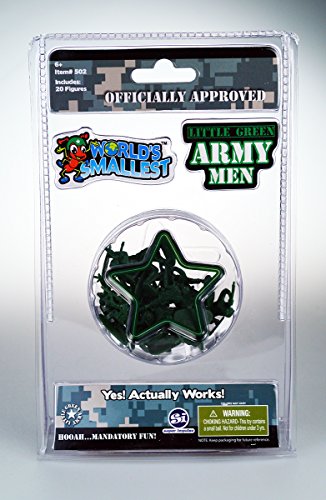 -. Binding : Toy -. Brand : Worlds Smallest -. Department : Gag Gifts -. EAN : 0859421005138 -. Feature : 20 Individual miniature army men figures with 10 different soldier poses. / These army toys action figures are no taller than 1" / Includes carrying container that allows for easy storage and grants portability for these toy soldiers. / Promotes use of imagination while children can create narratives and story plots! / Great toys for boys or girls to play Army Men and dream of saving the world. -. IsAdultProduct : 0 -. Label : Super Impulse -. Manufacturer : Super Impulse -. MPN : 502 -. NumberOfItems : 1 -. PackageQuantity : 1 -. PartNumber : 502 -. ProductGroup : Toy -. ProductTypeName : TOYS_AND_GAMES -. Publisher : Super Impulse -. Studio : Super Impulse -. Title : Little Green Army Men- 20 Pocket Sized Soldiers with 10 Different Poses -. UPC : 859421005138
