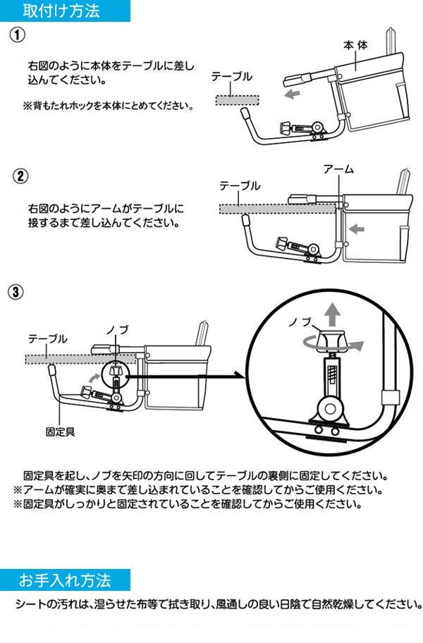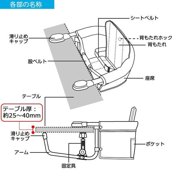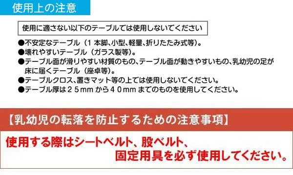 | 仕様 | ■完成品 ■対象月齢:5ヵ月~36ヵ月(腰がすわってから約15kgまで) ■取付け可能なテーブル厚:約25~40mm |