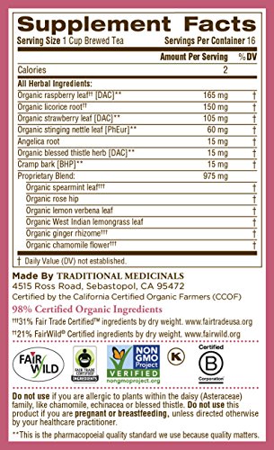-. Feature : Supports a Healthy Menstrual Cycle* / Non-GMO Project verified; 98% Certified Organic Ingredients; 31% Fair Trade Certified ingredients; 21% FairWild Certified ingredients; Kosher / Herbal Supplement. The highest quality, pharmacopoeial grade herbs / Taste: Pleasantly herbal, with hints of citrus and mint / 1 box containing 16 sealed tea bags