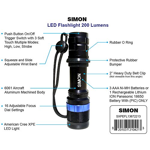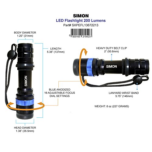 -. Title : Simon Mini LED Flashlight a Multipurpose Torch Light for Everyday Use with Bright 200 Lumens of Power with 16 Adjustable Focus Beam Settings. Lifetime Limited Warranty Part # SXPEFL13672213 Camping