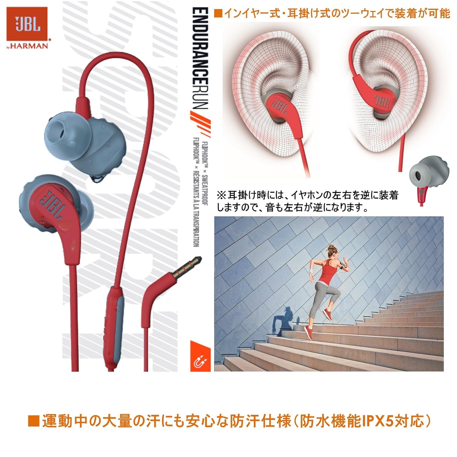 音場豊かな8.2mmダイナミックドライバーを搭載したインイヤーイヤホン 耳から抜け落ちにくく、長時間快適に使えるイヤチップを採用 運動中の大量の汗にも安心な防汗仕様(防水機能IPX5対応) イヤホン部にマグネットを内蔵し、絡みを防止 インイヤー式・耳掛け式のツ-ウェイで装着が可能 曲の操作・通話が可能なマイク付き1ボタンリモコン搭載 全4色の豊富なカラーバリエーションをご用意