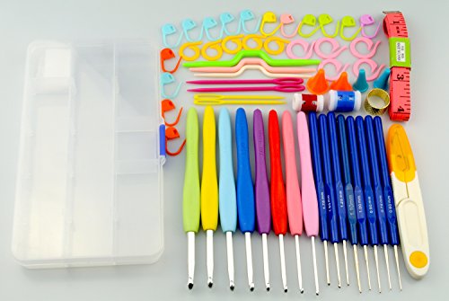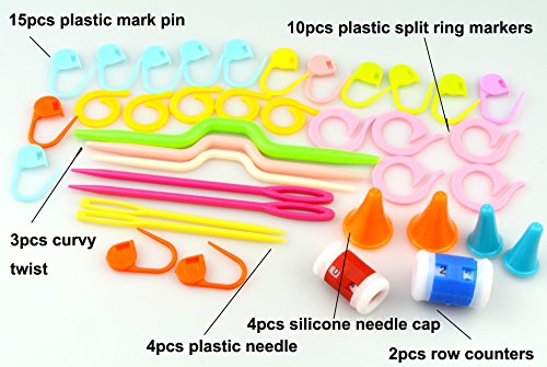 - Pack of 58,16 x different size crochet needle(0.6-6mm), 15 x Locking Stitch Makers,4 x Needle Point Protectors, 4 x Suture Needles, 3 x Crooked Needle, 2 x Row Counter, 1 x Thimble, 1 x Scissors, 1 x Tape Measure, 1 x storage box