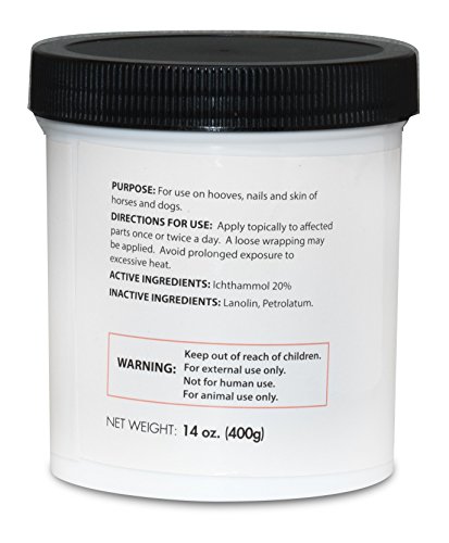 Ichthammol 20% Ointment This treatment applies to the following species: Dogs Horses Manufacturer: Trifecta Pharmaceuticals USA For animal use only. Keep out of reach of children. Ichthammol 20% Ointment Indications Apply as an ointment to weak and brittle hooves and nails in horses and dogs. Can be used as a skin antiseptic to promote healing of minor skin abrasions and inflammations and as an agent for soothing and softening areas of skin irritation. CONTAINS: Ichthammol, anhydrous lanolin, petrolatum. Directions For Use Apply to affected area once or twice a day. A loose bandage may be applied. Avoid prolonged exposure to excessive heat. Drawing Salve Promotes Healing In Wounds And Treats Chronic Inflammation. It Can Be Used As An Anti-inflammatory And Helps Relieve Itching And Swelling. https://dailymed.nlm.nih.gov/dailymed/drugInfo.cfm?setid=ddcd7c3f-b9cc-4d69-9183-4c5aa20f8608Feature