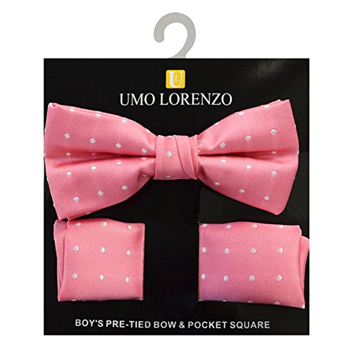 (Umo Lorenozo)/Accessories/Ties/DIRECT FROM USA/Boy's Salmom Pink Polka Dots Polyester Woven Pre-Tied Banded Bow Tie Pocket Square Set