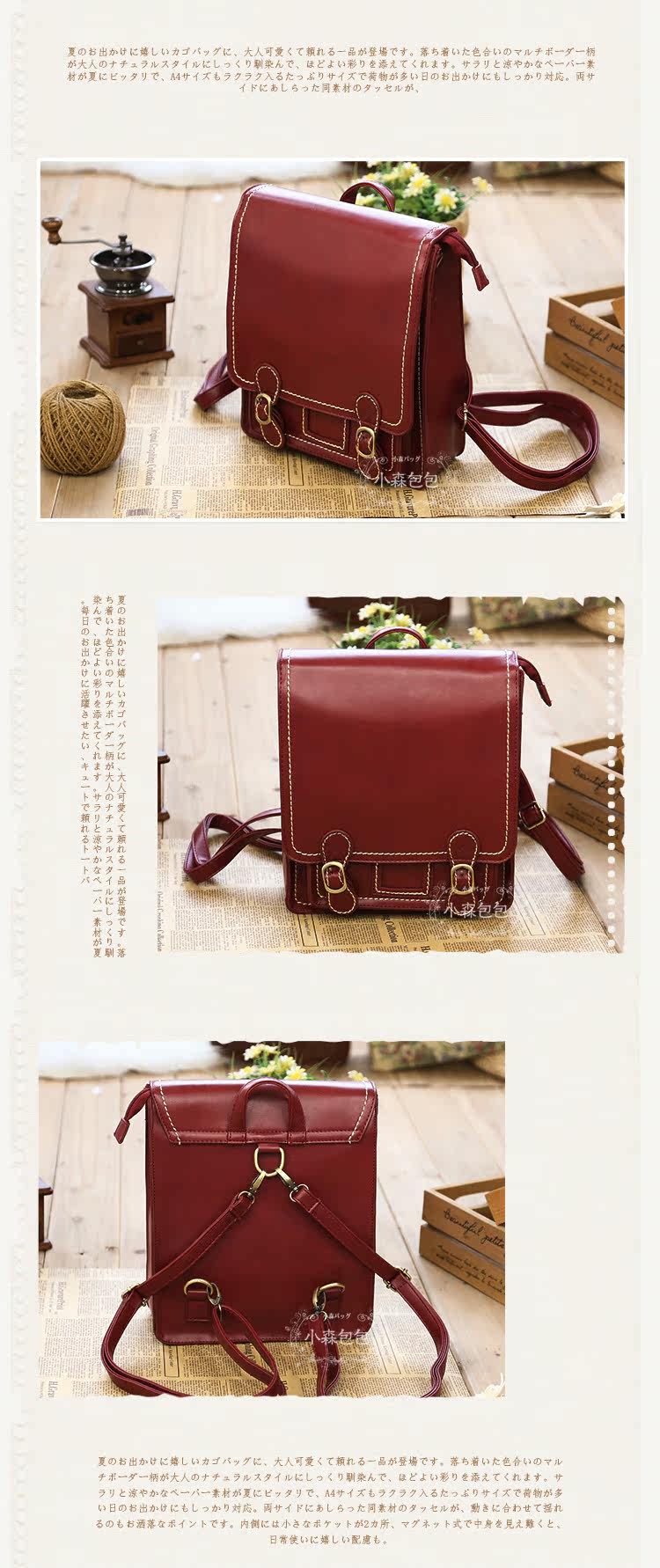 型号 森057面料 PU皮重量 0.7KG内衬 PU皮配件 两根肩带 可调节款式 斜跨 双肩 手提尺寸 底长25CM 高30CM 厚9CM肩带总长125CM 可调节容量 可放普通三折雨伞 IPAD 手机 纸巾 化妆小物 长款钱包 放A4会顶到拉链导致拉链不可拉上结构 一个拉链壁袋 一个挖袋