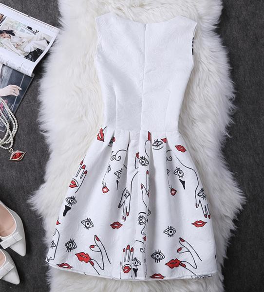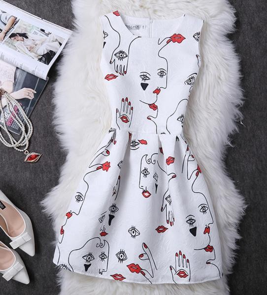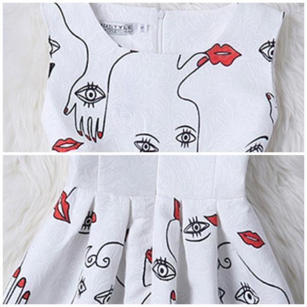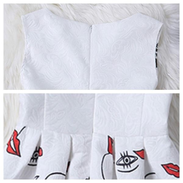 レトロなジオメヒューマンプリント ノースリーブ Aラインワンピース ドレス ブラック/XL