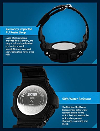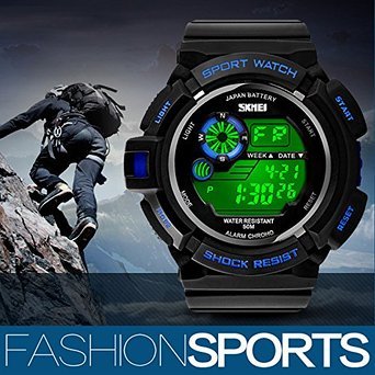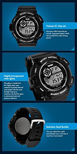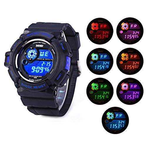 -. Feature : WATERPROOF FUNCTION: 164 ft waterproof (50 M) - 5ATM. NOTE: please DO NOT press any buttons in the water / DESIGN for SPORT: shock resistant, stop watch, and 5 colors LED back light functions make it perfect for all kind of sports, indoor and outdoor activities or daily use. / MULTI-COLOR LED with COMFORT (PRESS AND HOLD UPPER LEFT BUTTON TO CHANGE COLOR): 5 colors LED back lights, soft silicon rubber watch band bring comfortable wearing experience. With simplicity, the whole watch is sport fashion design, also a great gift for family or friends. / MULTI-FUNCTIONAL: Calendar Date / Week / Month, Alarm, Water Resistant, LED Display, 5 Different Colors LED Back Light, Shock Resistant, Stop Watch / Solid stainless steel back cover. Water resistant. Battery: CR2025 Battery Life: 3 Years