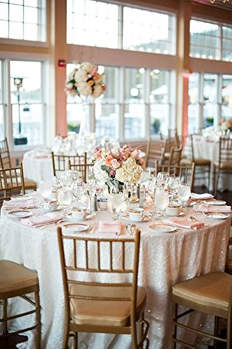 - √ Pretty Sequin Tablecloth: This shimmer sequin Table Linen will look romantic and elegantly shabby chic as a door covering, hung between two trees and gently blowing in the wind for wedding party photos, or behind the cake table as reception decor.