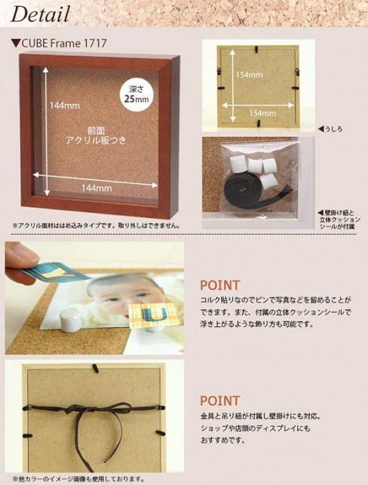 | 正方形のおしゃれなフォトフレーム。木目を活かしつつ、薄塗りになっているため、少し地肌が見えます。奥行が25ミリあり、背面がコルクになっているので、ピンなどを使ったフラワーアレンジやウェルカムボードとしてもオススメ♪(※コルクシートは裏板に付着していて、はがすことはできません。) |