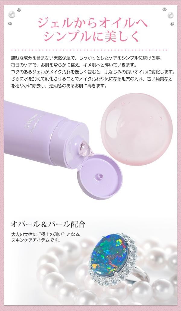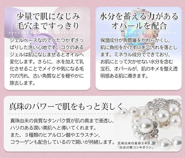 | オパール&パールを配合!!コクのあるジェルがメイク汚れを優しく包むと、肌なじみの良いオイルに変化します。さらに水を加えて乳化させることでメイク汚れや気になる毛穴の汚れ、古い角質などを穏やかに除去し、透明感のあるお肌に導きます。大人の女性に「極上の潤い」となる、スキンケアアイテムです♪ |