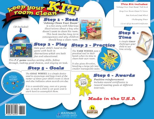 Studio : Sunrise Educational Materials Publisher : Sunrise Educational Materials Binding : Toy Product Description A 6 step fun program full of games and challenges, designed to establish the GOOD HABIT of keeping your room clean. Secretly teaching: Follow Through, Staying on Task, Basic Computer Skills, Orderliness, Making Good Choices, Perseverance, Sorting Skills, Goal Setting Achievement, Obedience, Breaking up a Large Task and Time Management.