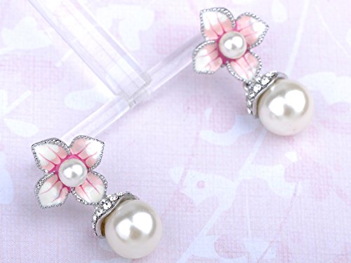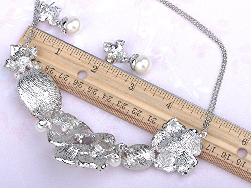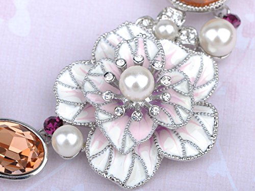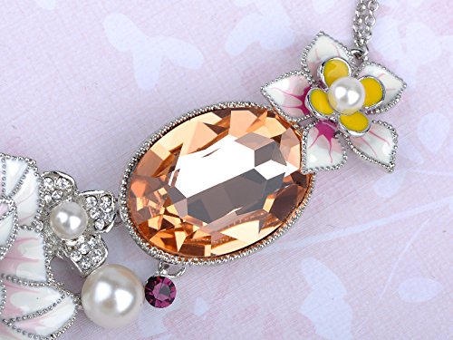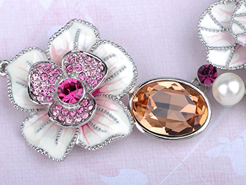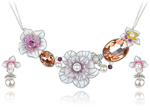 Feminine colors and design make this necklace extremely pretty and cute besides the elegant factor, this set definitely calls out for attention. Each flower enamel painted and outlined in Swarovski Crystal Elements. The large set of Synthetic Topaz jewels and faux pearl to accent the stylish look.Feature