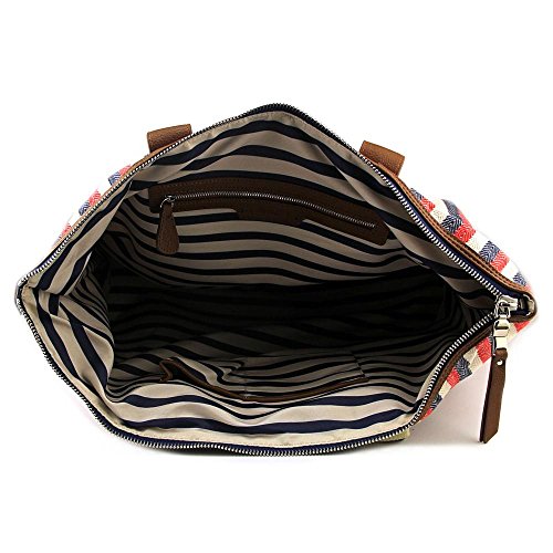 -. Feature : Large weekender tote in mixed stripes featuring faux leather trim and two-tone tasseled fob / Dual top handles