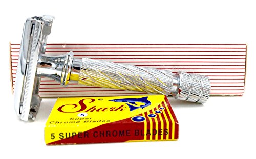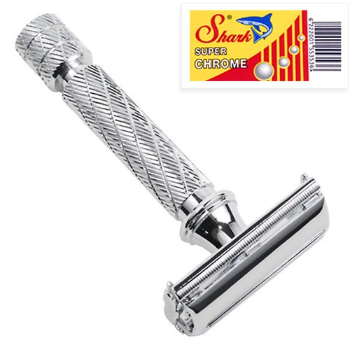 Parker 87R Butterfly Open Double Edge Safety Razor - Traditional Short Handle - 5 Shark Super Chrome Blades Included