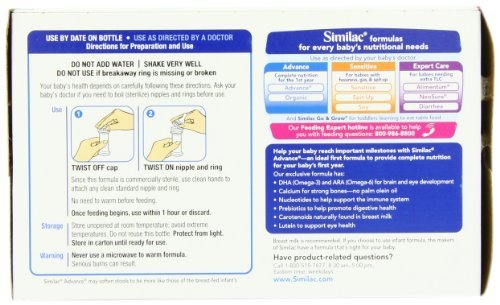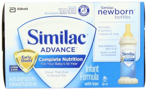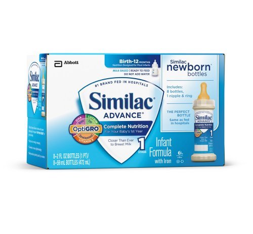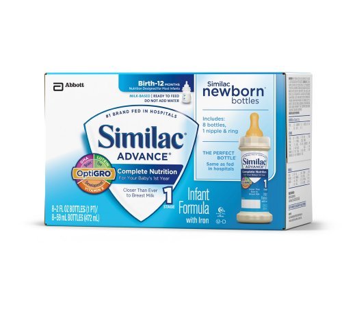 -. Binding : Baby Product -. Brand : Similac -. EAN : 0070074533650 -. Feature : With DHA & ARA - Special nutrients found in breast milk / For babies 0 - 12 Months / Provides calcium to help build strong bones / Supports brain and immune system development / Product has undergone a recent package change and the new package reads "Optigrow" on the label. However there is no change in the ingredients or contents. -. Label : Similac Advance Newborn Infant Formula with Iron, Stage 1 Ready-to-Feed Bottles, 2 Ounce, (2 Packs of 48) (Packaging May Vary) -. Manufacturer : Similac Advance Newborn Infant Formula with Iron, Stage 1 Ready-to-Feed Bottles, 2 Ounce, (2 Packs of 48) (Packaging May Vary) -. ProductGroup : Health and Beauty -. ProductTypeName : BABY_PRODUCT -. Publisher : Similac Advance Newborn Infant Formula with Iron, Stage 1 Ready-to-Feed Bottles, 2 Ounce, (2 Packs of 48) (Packaging May Vary) -. Studio : Similac Advance Newborn Infant Formula with Iron, Stage 1 Ready-to-Feed Bottles, 2 Ounce, (2 Packs of 48) (Packaging May Vary) -. Title : Similac Advance Newborn, Ready to Feed Bottles, 96 x 2-fl-oz Bottles -. UPC : 070074533650