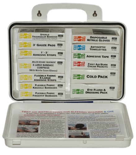 -. Feature : Convenient weatherproof plastic first aid kit, OSHA compliant wall mountable kit with carrying handle / Color-coded boxes: bandages- yellow, burn treatment- red, BBP/EMS- orange, antiseptics- blue, miscellaneous- green / Cellophane over wrap with a tear strip, FDA required labeling for lot numbers, expiration dates and Drug Facts / From Pac-Kit, the leader in industrial first aid / Measures 19-length by 11-inches width by 10-1/2-inches height / Contents inside box may be substituted with equivalent products in different brand names