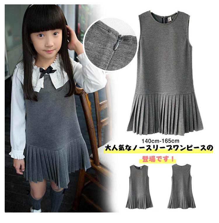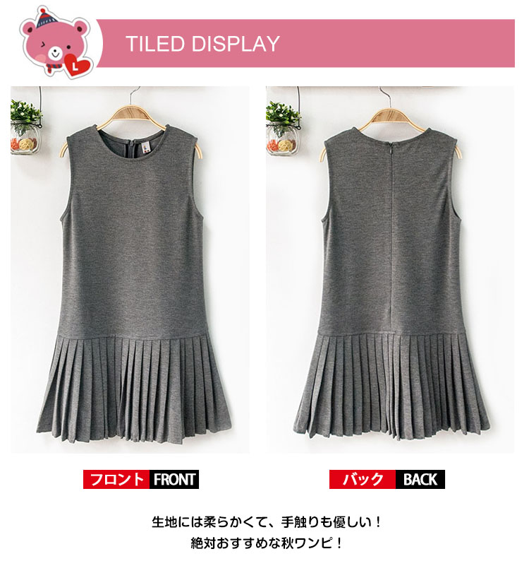 | 大人気なノースリーブワンピースの登場です!シンプルのラウンドネックでシャツなどのインナーと合わせてもすすめします!スカート部分にはプリーツになってスクール風溢れます!生地には柔らかくて、手触りも優しい!絶対おすすめな秋ワンピ! | |