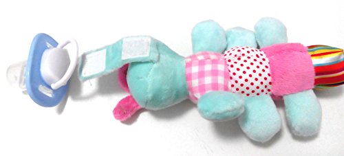 - Feature : ORTHODONTIC SLANTED MEDICAL GRADE SILICONE PACIFIER. Non-toxic silicone pacifier perfect for allergy sufferers: odourless, latex free, BPA, PVC and Phthalate Free. It comes with a PROTECTIVE COVER TO KEEP THE GERMS AWAY while not in use. / SOOTHING FOR BABY & TODDLER UP TO 36 MONTHS. ATTACH your baby's FAVORITE PACIFIER OR TEETHER to meet BABY'S DEVELOPMENT NEEDS. It can be used with a wide range of dummies with a loop (such as NUK, Philips Avent, The First Years GumDrop, Tommee Tippee, JollyPop, Dr Brown's) and teethers with a loop (like the Razbaby teether). (Some pacifiers such as MAM & Munchkin may require an adapter which is readily available from other sellers on Amazon). / DETACH PACIFIER HOLDER for EASY CLEANING, STERILZING & REPLACEMENT. 100% Satisfaction Guarantee! / PERFECT BABY SHOWER GIFT. Pacifier & plush toy pacifier holder - 2 FOR THE PRICE OF 1 - come in a transparent SELF-SEALED PLASTIC BAG to make for a great addition to baby baskets. / LIGHT WEIGHT COTTON TOY (3oz, 8"x6"x2") TO DEVELOP YOUR BABY'S SENSES. Ultra soft animal pacifiers holders make it easy for baby to grasp, hold & manipulate the pacifier. The different textures and patterns (all soft) are perfect for the development of baby's senses.