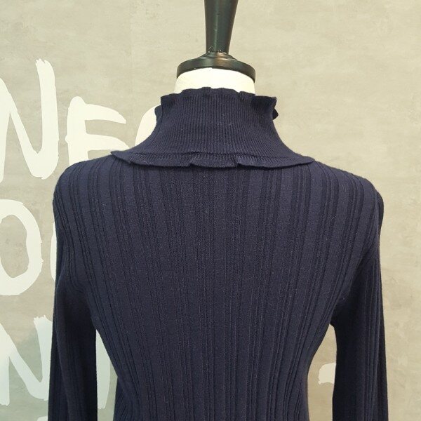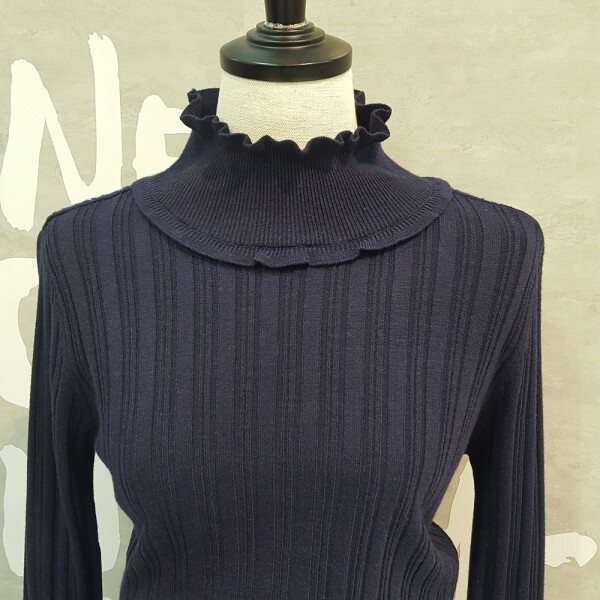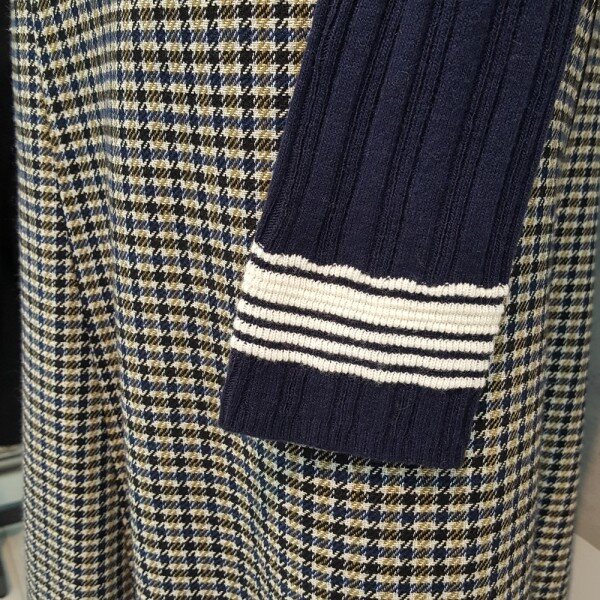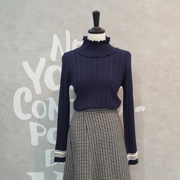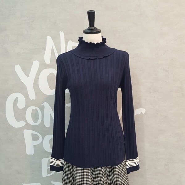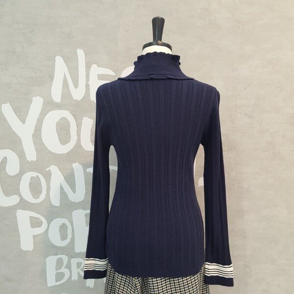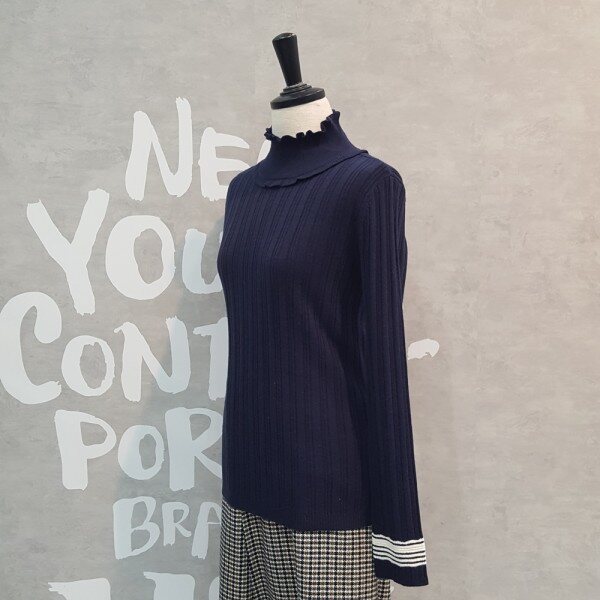 패치한 느낌의 폴라 디자인이 유니크한 스트라이프 포인트 소매의 풀오버입니다