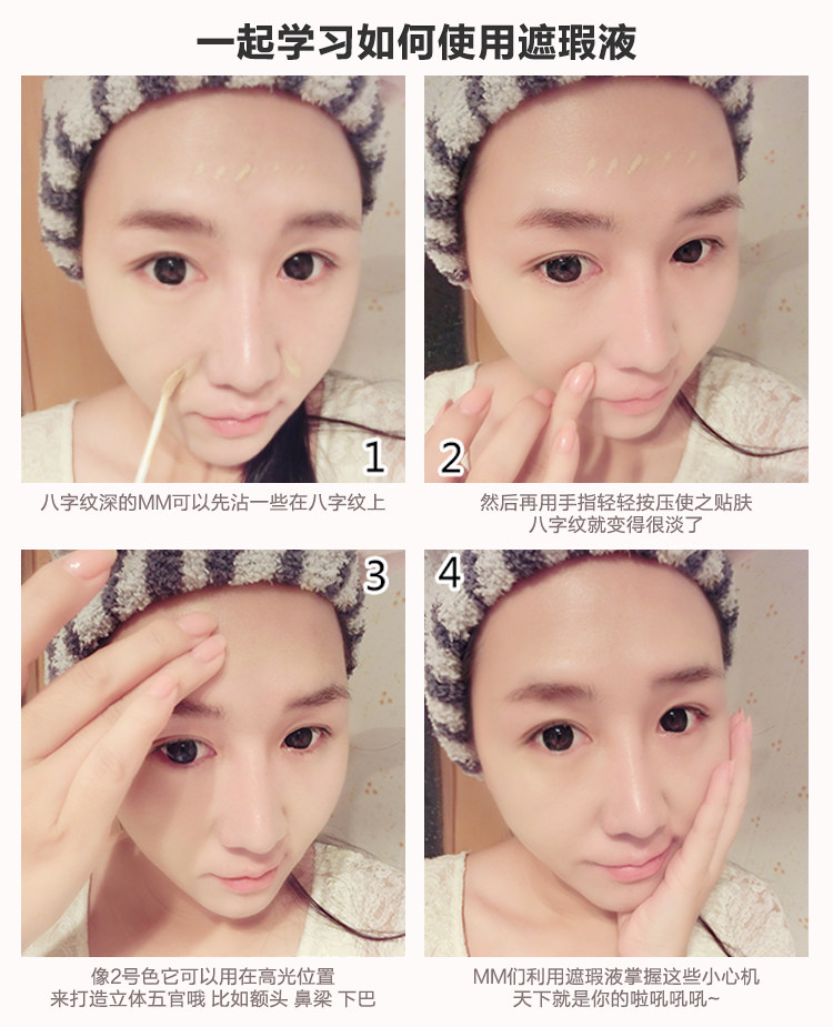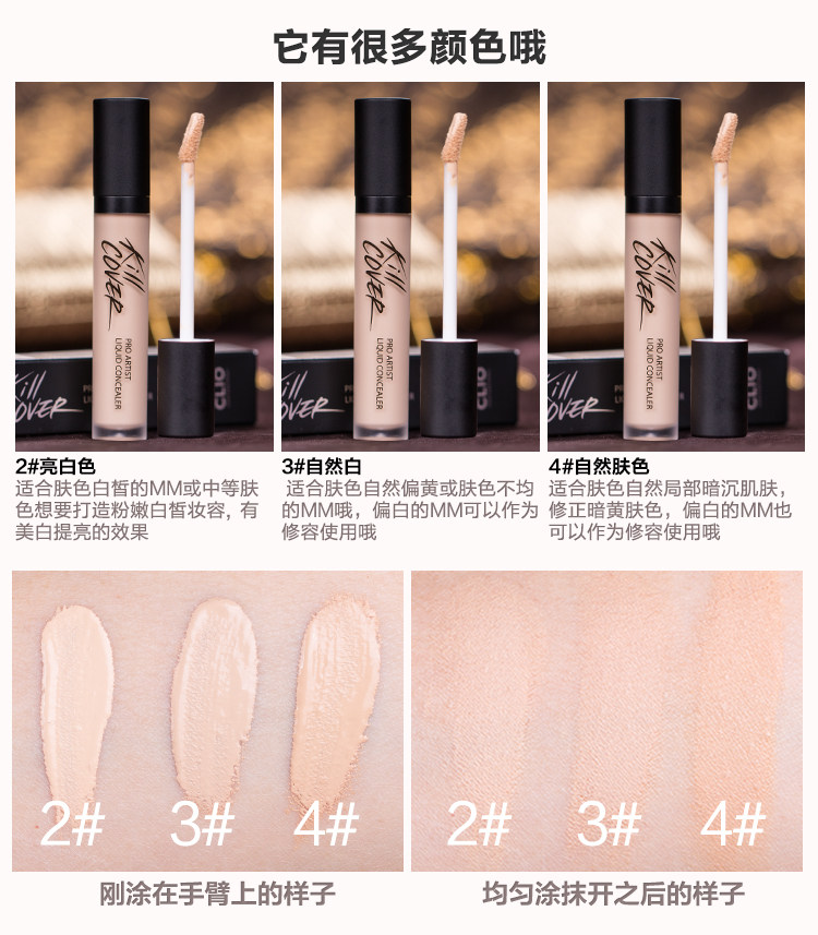 2#亮白色 适合肤色白皙的MM或中等肤色想要打造粉嫩白皙妆容,有美白提亮的效果 3#自然白 适合肤色自然偏黄或肤色不均的MM 4#适合符合较黑,或喜欢健康色的MM们 底妆完成后涂抹在斑点或其他需要遮瑕部位,轻轻沾取拍打即可 |