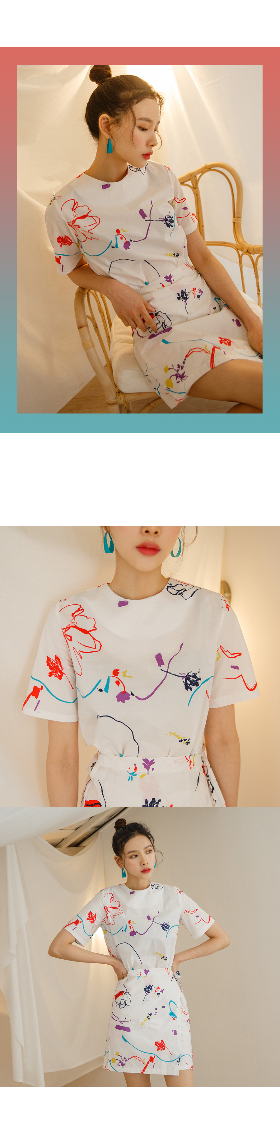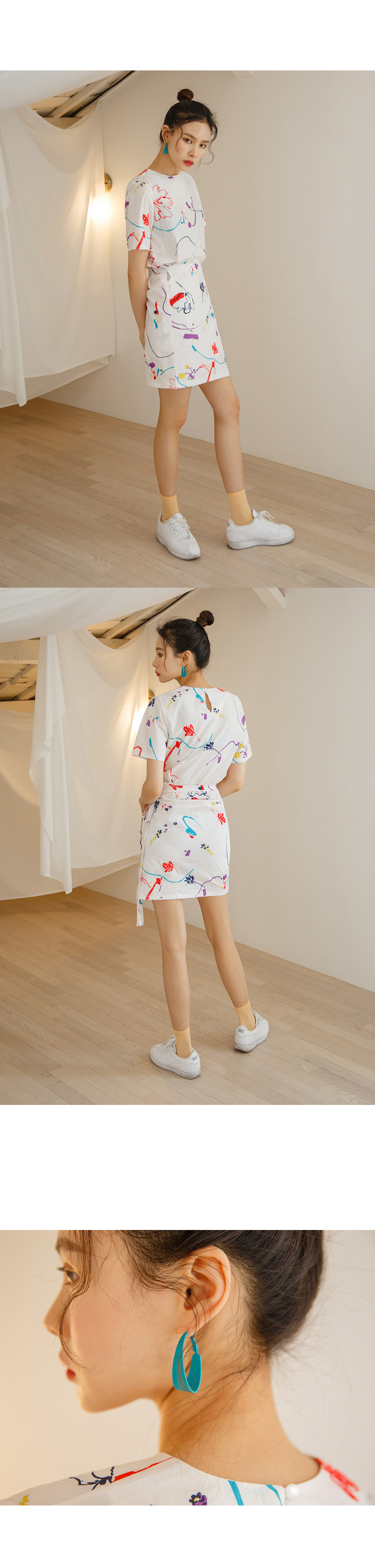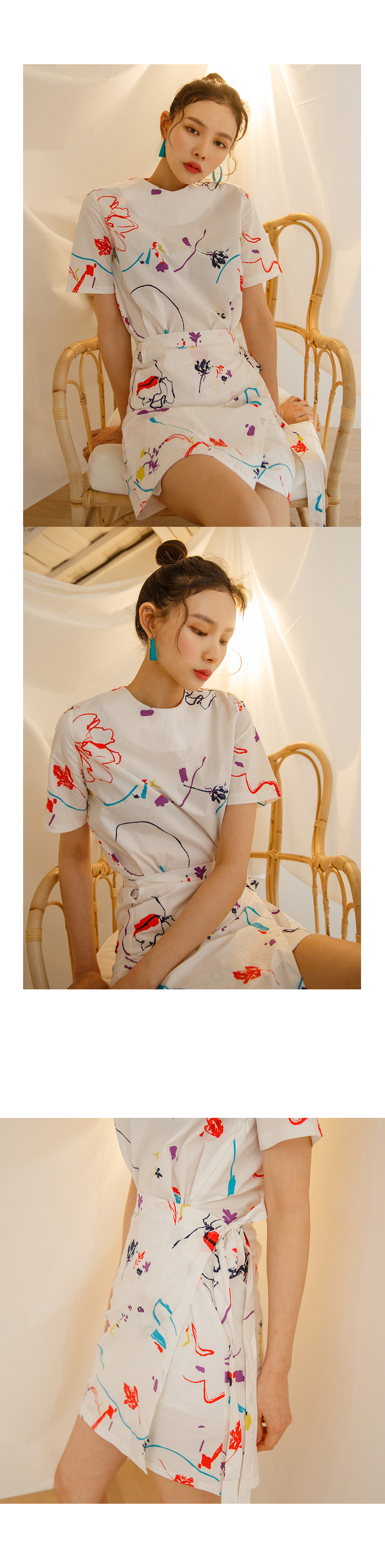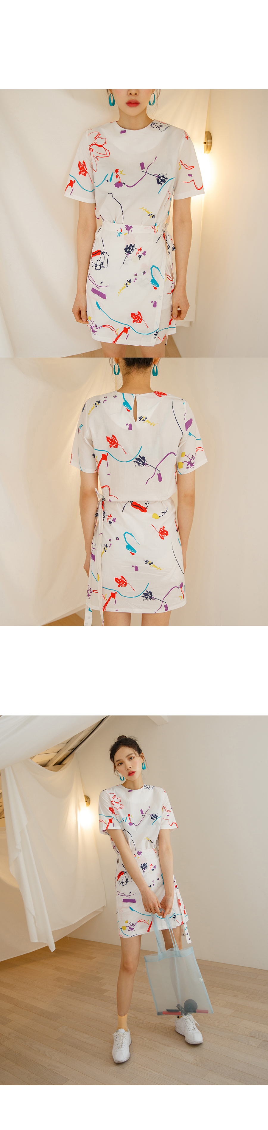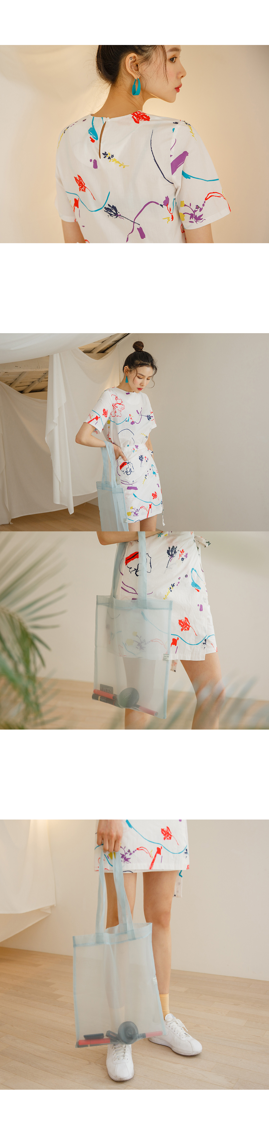 MD COMMENT유니크한 물감 프린팅이 매력적인 랩 원피스입니다 얇은 면소재로 제작이되어 지금부터 여름까지 쭉~ 즐기실 수 있구요 짧지않는 기장감으로 부담없이 착용가능하며 화이트 컬러는 약간의 비침이있어 부담스러우신 고객님들께서는 스킨톤의 이너 착용하시는걸 권장해드려요화사한 컬러로 S/S시즌 스타일리쉬한 룩을 완성시켜주는 아이템이에요!