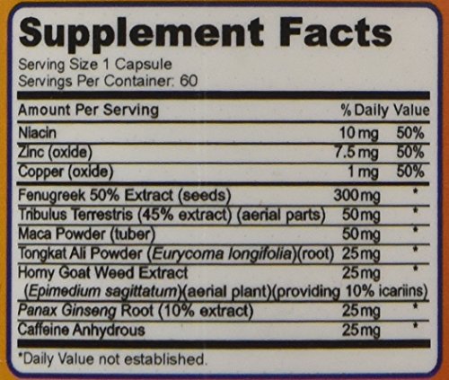 - Feature : Zinc plays a vital role in fertility. In males, zinc helps protect the prostate gland from infection (prostatitis) and ultimately from enlargement (prostatic hypertrophy). Zinc helps maintain sperm count and mobility and normal levels of serum testosterone. / In traditional medicine, Tribulus has promoted male fertility, sexual response, urinary tract function, and libido. Some sources have even . In Ayurvedic medicine however, Tribulus is regarded as an herb that benefits the entire body. Modern research appears to support many of these holistic effects. / One of the maca benefits for men, was discovered by the Incas in historical instances and this benefit is that Maca can act as an aphrodisiac. / Unique and effective blend of Niacin, Zinc, Copper and Herbs - Fenugreek Seed, Tribulus, Maca Powder, Tongkat Ali, Horny Goat Weed, Panax Ginseng Root and Caffeine / Quality made in the USA: 1 Month Supply of 60 capsules, made in the USA according to cGMP stardards. Use with pride and take with confidence.